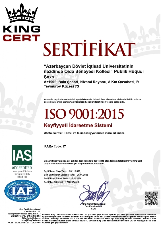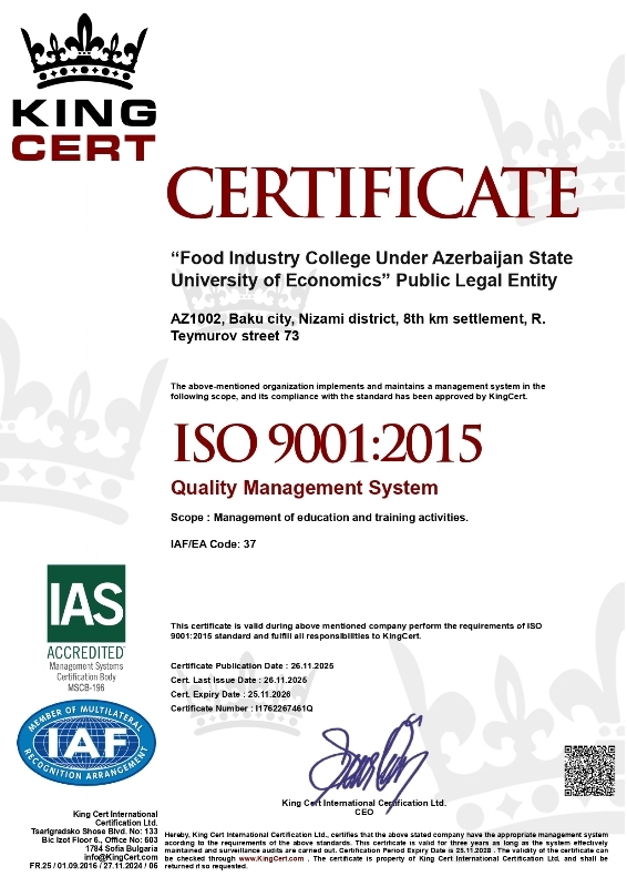 Kollec beynəlxalq idarəetmə standartları üzrə nüfuzlu sertifikatlar əldə edərək, təhsildə keyfiyyət və müasir yanaşmanı rəsmi şəkildə təsdiqləyib. Tədris və idarəetmə proseslərinin müasir dövrün tələblərinə uyğunlaşdırılması istiqamətdə həyata keçirilən sistemli işlərin nəticəsi olaraq, ISO 9001:2015 – Keyfiyyətin İdarəetmə Sistemi və ISO 21001:2018 – Təhsil və Təlim Təşkilatları üçün İdarəetmə Sistemi standartları üzrə uyğunluq auditindən uğurla keçib. Auditin nəticəsində Qida Sənayesi Kolleci müvafiq beynəlxalq sertifikatlara layiq görülüb. ISO 9001:2015 sertifikatı kollecdə inzibati idarəetmənin şəffaflığına və effektivliyin təmin edildiyinə, ISO 21001:2018 standartı isə təhsilin keyfiyyətinə, tələbə məmnuniyyətinə və tədris metodologiyasının beynəlxalq meyarlara uyğunluğuna zəmanət verir.