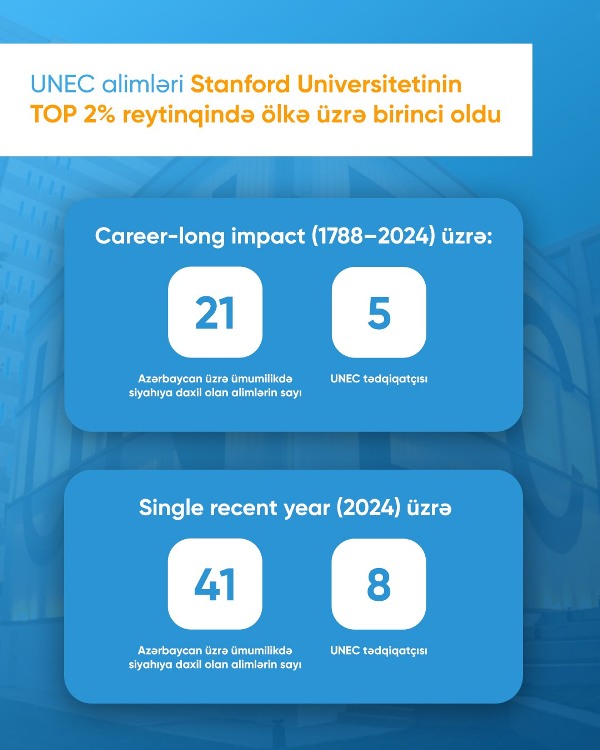 “Career-long impact” göstəricisinə əsasən, yəni 1788–2024-cü illər ərzində alimlərin nəşr və istinad göstəricilərinə görə aparılan qiymətləndirmədə Azərbaycan üzrə 21 tədqiqatçı siyahıya düşüb. Onlardan 5 nəfəri UNEC-in əməkdaşıdır. Bu, ümumi göstəricinin 24%-ni təşkil edir və UNEC bu nəticə ilə ölkədə 1-ci yerə yüksəlib. Xüsusilə sevindirici haldır ki, ötən il bu kateqoriyada UNEC-dən heç bir tədqiqatçı siyahıda yer almamışdı.