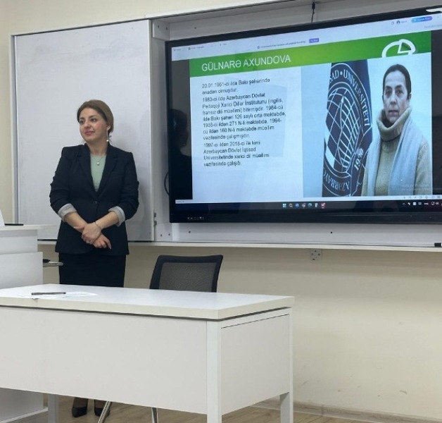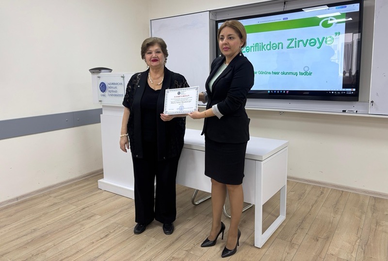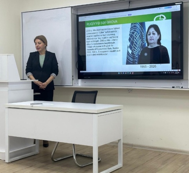 Tədbirdə Xarici Dillərin Tədrisi Mərkəzinin müdiri Aynur Mirzəyeva çıxış edərək, UNEC-də uzun illər xarici dillərin tədrisi ilə məşğul olmuş təhsil işçilərinin xidmətlərini təqdimat vasitəsilə xatırlayıb və onların fəaliyyəti haqqında iştirakçılara məlumat verib.