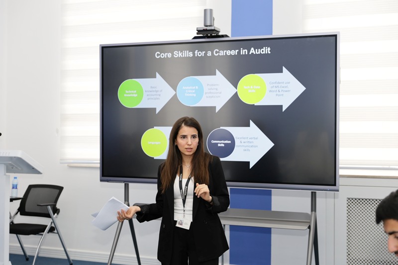 Tədbirdə baş audit meneceri Günay Cabbarzadə, baş audit mütəxəssisi Dəniz Eyyublu və baş İR mütəxəssisi Flora Əzimova çıxış edərək, tələbələrlə həm peşəkar biliklərini, həm də real iş təcrübələrini bölüşüblər.