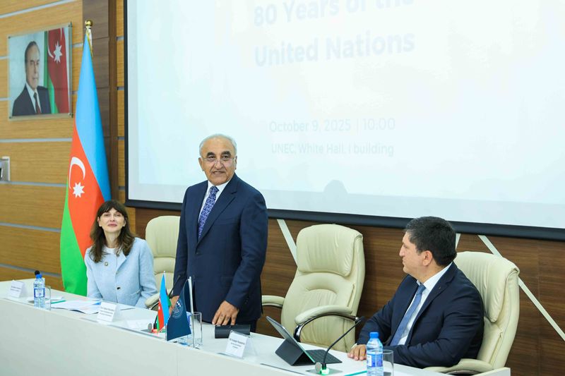 Açılışda çıxış edən rektor Ədalət Muradov BMT-nin 80 illik yubileyi çərçivəsində UNEC tələbələri ilə görüşün keçirilməsindən məmnunluğunu ifadə edib. Rektor tədbirin əlamətdar günə təsadüf etdiyini diqqətə çatdıraraq, bu gün açıqlanan Times Higher Education (THE) Dünya Universitetləri Reytinqində UNEC-in ilk dəfə olaraq yer aldığını, reytinqdə Cənubi Qafqazın və Azərbaycanın birinci universitet olduğunu, dünyanın isə ən yaxşı 801-1000 universiteti sırasına yüksəldiyini diqqətə çatdırıb. Dayanıqlı İnkişaf Məqsədləri üzrə əldə olunan uğurları diqqətə çatdıran rektor, UNEC-in bu istiqamətdə ölkənin ən yaxşı ikinci universitet olduğunu, gələcəkdə mövqeyini daha da gücləndirəcəyini deyib.