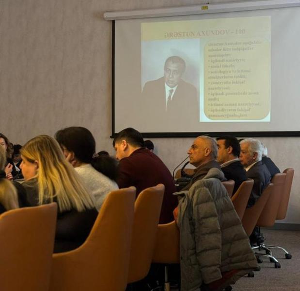 Sonra “İqtisadiyyat” kafedrasının dosenti Xankişi Xankişiyev alimin həyat yolu, çoxşaxəli elmi fəaliyyəti, pedaqoji irsi və formalaşdırdığı elmi məktəb haqqında geniş təqdimatla çıxış edib. Bildirilib ki, Ərəstun Axundovun irəli sürdüyü “Vaxta qənaət qanunu” konsepsiyası iqtisadi proseslərin səmərəliliyinin artırılması baxımından mühüm nəzəri əsas kimi dəyərləndirilir.