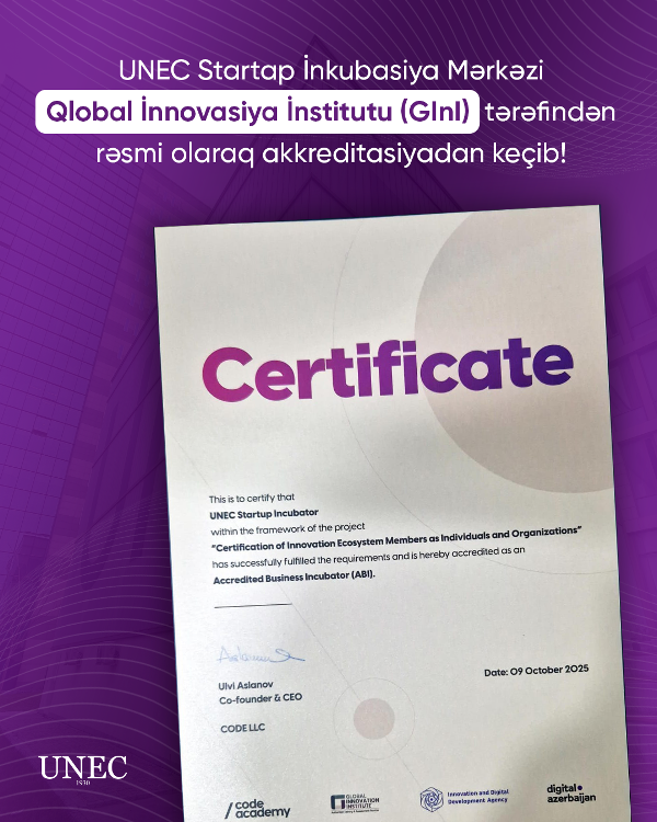 Azərbaycan Dövlət İqtisad Universitetinin (UNEC) Startap İnkubasiya Mərkəzi innovasiyalar sahəsində dünyanın aparıcı sertifikatlaşdırma qurumu olan Qlobal İnnovasiya İnstitutu (GInI) tərəfindən rəsmi olaraq akkreditasiyadan keçib.