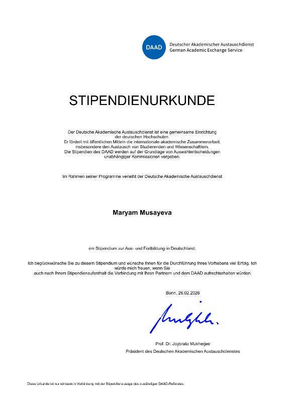 Məryəm Musayeva proqram çərçivəsində Almaniyada keçiriləcək bir aylıq yay məktəbində iştirak etmək hüququ qazanıb.