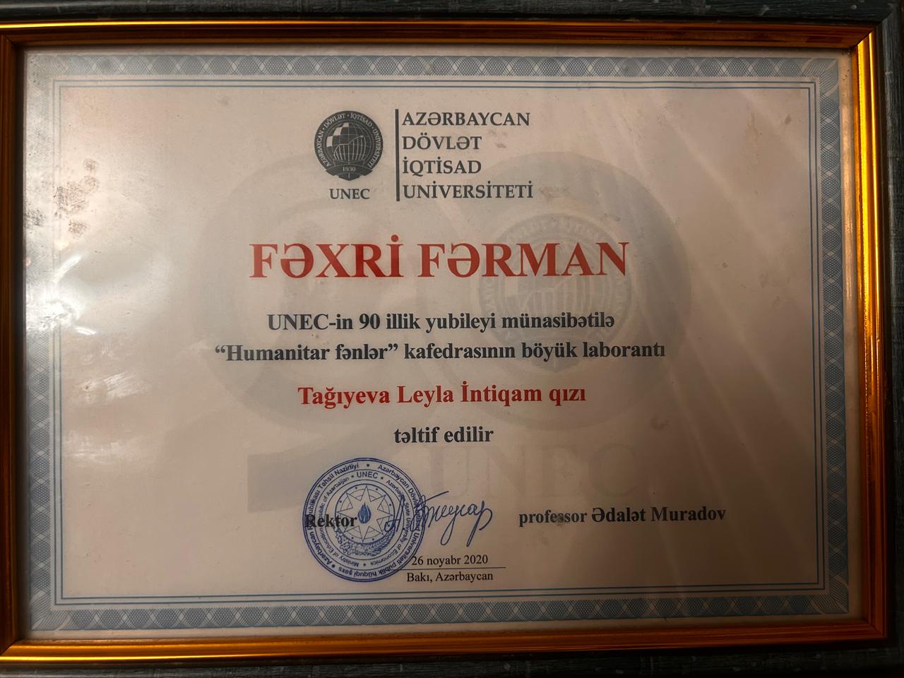 2020-ci ildə UNEC-in 90-illik yubileyi münasibətilə Fəxri Fərmanla təltif edilib.