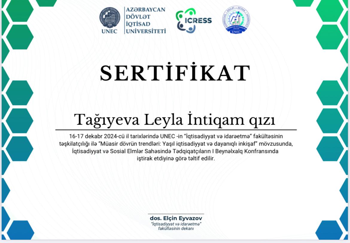 2024-cü ildə UNEC-in “Umumi Fənlərin Tədrisinin Təşkili”nin departamentinin direktoru dos.G.N.Rzayeva tərəfindən təşəkkürnamə ilə təltif olunub.
